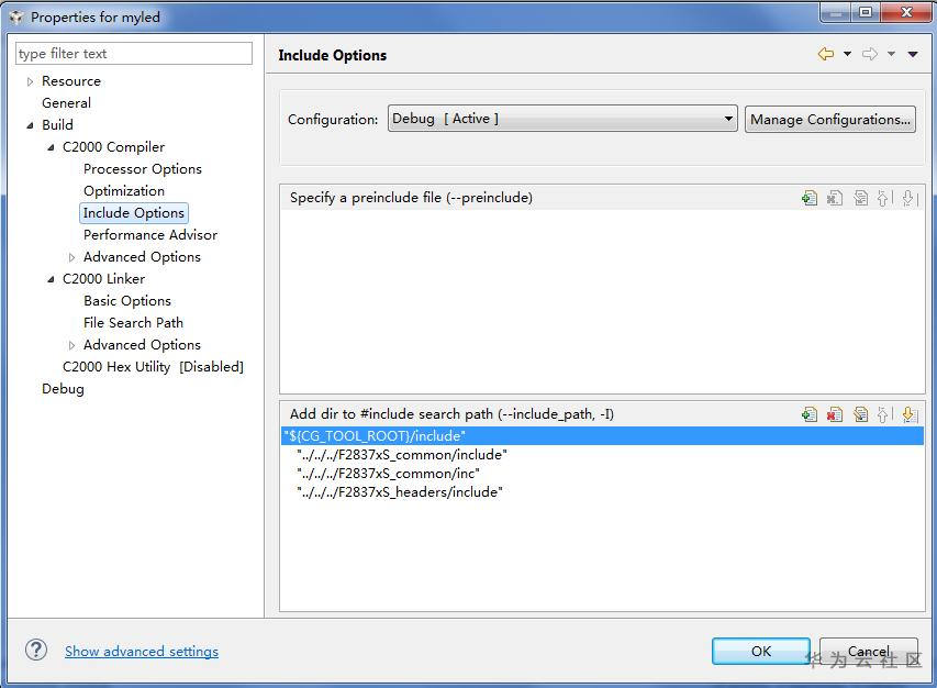 右键myled工程,点击Properties,在弹出的对话框中添加相应的头文件路径,如下: