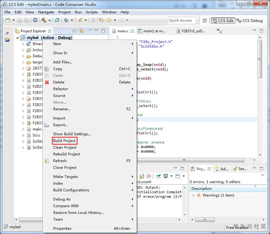 右击工程,在弹出来的对话框中点击"Build Project",即可对当前工程编译并产生可执行.out文件,最后再按照前面章节步骤进行加载,就可以运行编译好的.out文件。