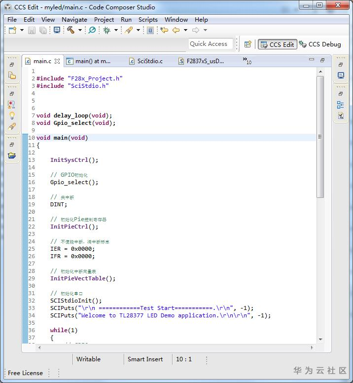 编辑main.c文件,增加用户需要实现的功能代码,如下图所示: