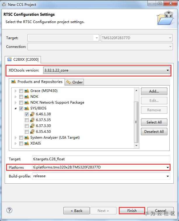 选择对应的XDCtools版本和Platform,点击Finish,完成工程的新建。