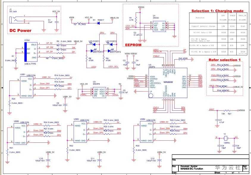 采用MA8608 USB HUB,低成本,用户还可以通过挂EEPROM,实现多个集线器配置选项.