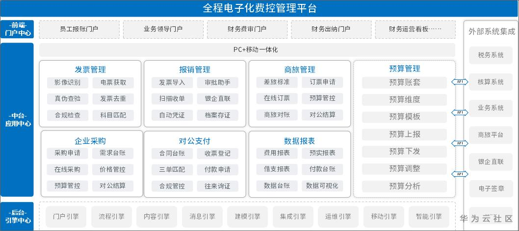 与外部系统集成对接的能力:通过与预算模块对接,还可以实现多维度预算及费用标准的自动化管控。通过与外部商旅、采购等平台对接可以实现在线商旅订票与在线企业采购。