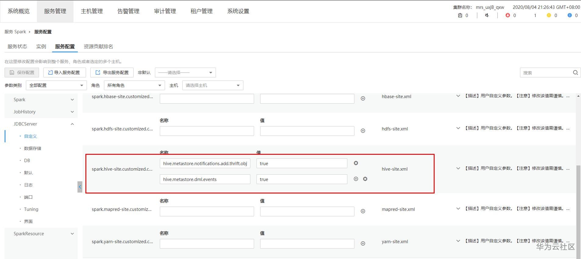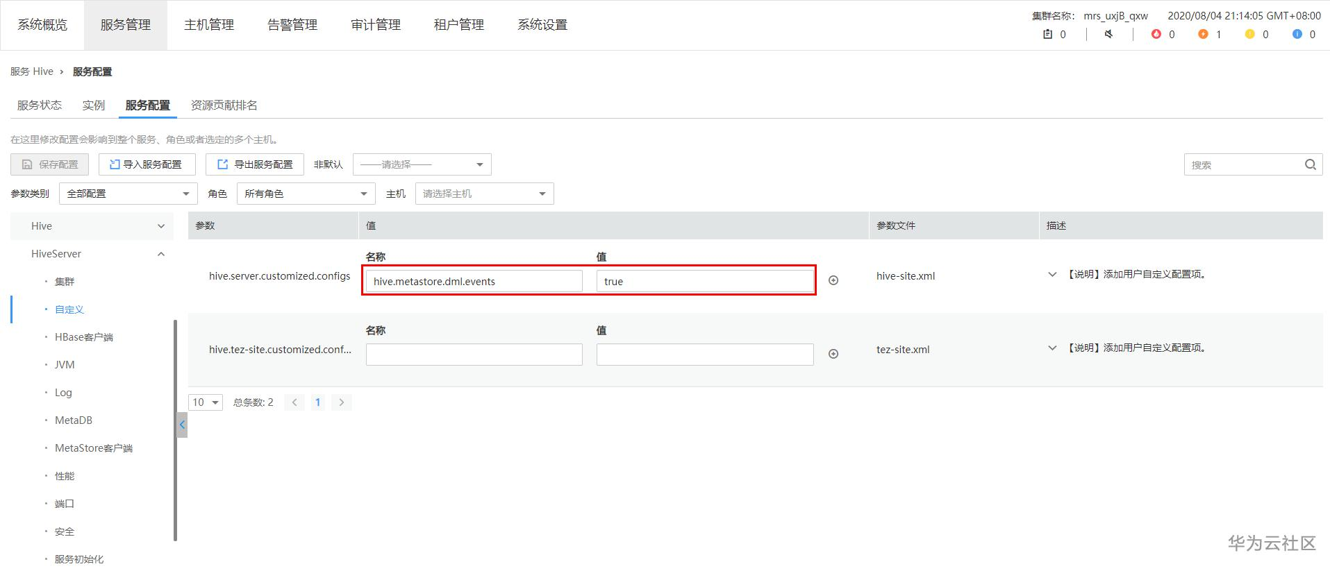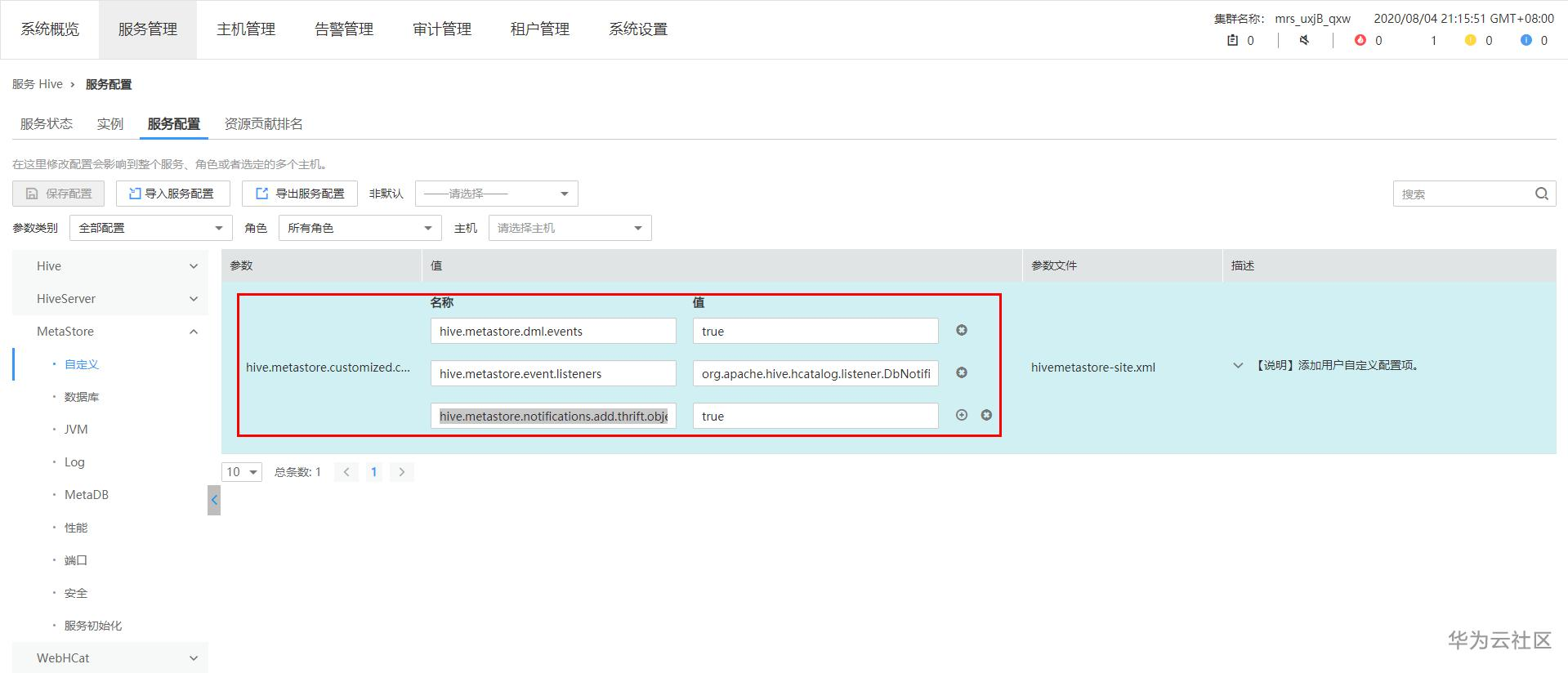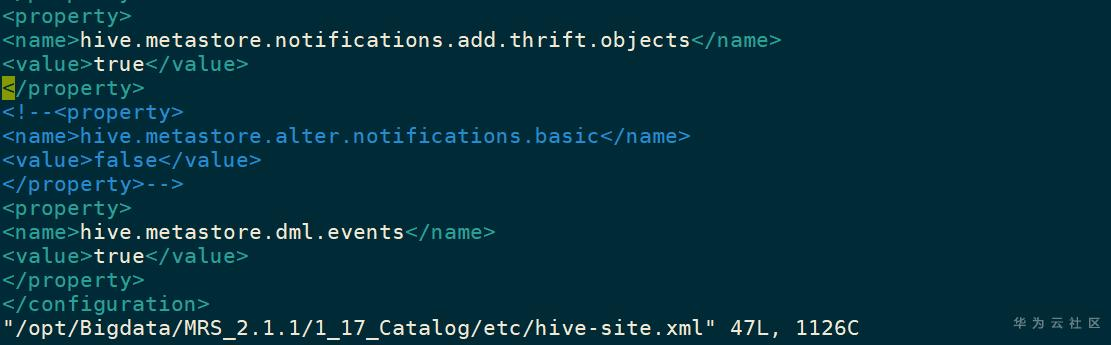 impala的catalog hive-site.xml配置文件添加hive.metastore.dml.events=true和hive.metastore.notifications.add.thrift.objects=true,修改文件位置,catalog实例所在节点/opt/Bigdata/MRS_2.1.1/1_17_Catalog/etc/hive-site.xml。