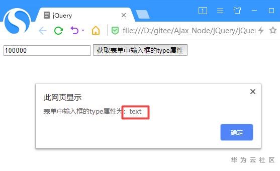 alert("表单中输入框的type属性为:"+ $("#txtInput2").attr("type")); //查询id为txtInput2的元素,使用attr("type")获取表单控件type属性