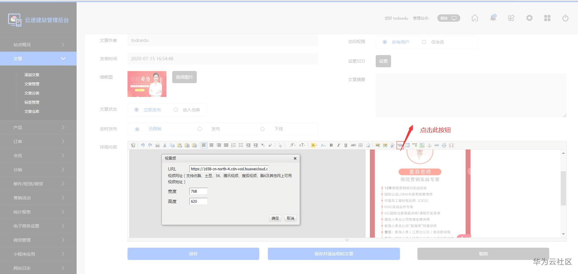 然后在下面详细内容里选择插入视频按钮,这个不支持直接上传视频,只支持视频的URL链接,你需要先把视频上传到其它的视频网站,我用的是华为视频点播,在视频点播后台把播放地址复制过来就可以了,下面的宽度和高度需要根据你自己的页面大小来设置,如果需要在视频旁边放图片介绍,只需点击插入图片按钮即可,然后调整图片的大小即可。所有内容编辑完成后点击保存。这样我们的文章就添加完成了,如需添加其它文章方法同上。