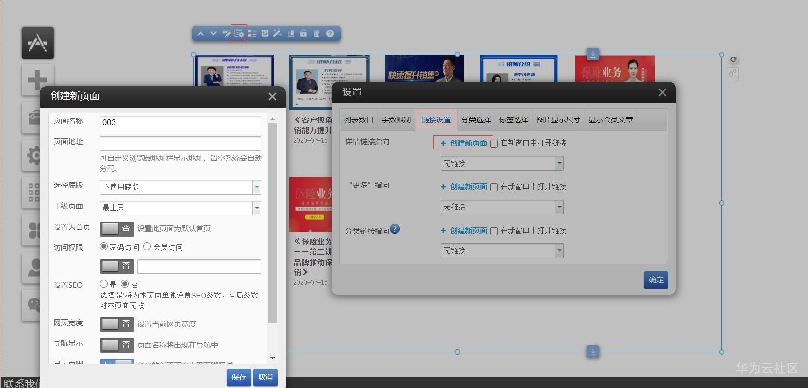 3、点击设置按钮,在链接设置下详情链接指向这项,选创建新页面。其它选项设置根据自己需求设置。