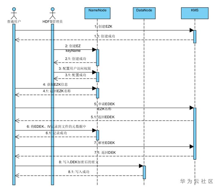 用户申请好秘钥后,将秘钥名称告诉给HDFS的管理员,管理员就可以使用这个秘钥名称跟目录关联起来,给用户创建加密区。创建好加密区后,用户写入加密区的数据就都是经过加密保存的。要访问加密区中的数据,需要同时具有HDFS文件和加密区秘钥的访问权限。