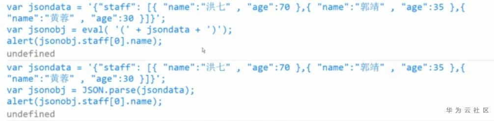 在代码中使用eval是很危险的!特别是用它执行第三方的JSON数据(其中可能包含恶意代码)时,尽可能使用JSON.parse()方法解析字符串本身,该方法还可以捕捉JSON中的语法错误。