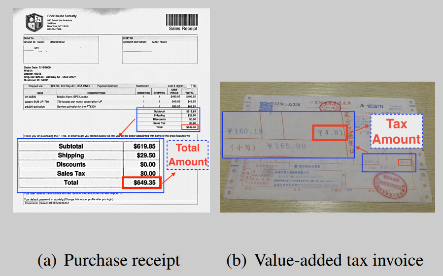 信息抽取(Information Extraction, IE)领域有两个经典的解决方案,一个是基于规则的正则表达式匹配,另一个是基于学习的BiLSTM+CRF方法。在版式较为固定的情况下,这两种方法都可以取得良好的结果。例如,在ICDAR 2019的发票信息抽取比赛SROIE [1] 中,冠军队伍就是采用了正则表达式,而季军队伍采用的是BiLSTM+CRF方法。但是对于版面复杂、视觉信息丰富(Visually Rich Documents,VRD)的文档,如图1所示,这两种方法都忽略了视觉等关键信息,从而使得IE准确率下降。