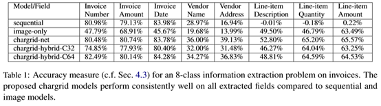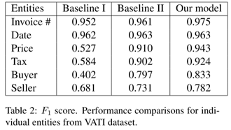 相比于传统的仅基于文本的IE方法,该框架能够同时利用文本信息和文档结构信息,因此在精度上有了较大提升,特别是对于长文本字段,因为encoder-decoder结构能够有效学习文本的上下文信息。具体结果如下: