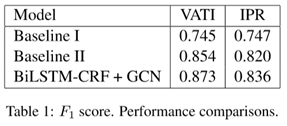 其中Baseline I和II是两种不同输入处理方式的BiLSTM-CRF系统。可以看到,加入图卷积网络之后,准确率有了接近两个点的提升。虽然提升并不十分明显,但是其研究思路仍然具有参考价值。