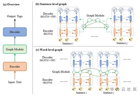 这篇文章与第二篇思路十分接近,都是在BiLSTM-CRF系统中嵌入图卷积模块,如图6所示,以更好的利用文本上下文信息。不同之处在于图卷积操作的实现,此处不再细叙。此外,除了将每个文本段视为一个节点,该论文也探究了将每个token视为一个节点,以处理更细粒度的语义关系。
