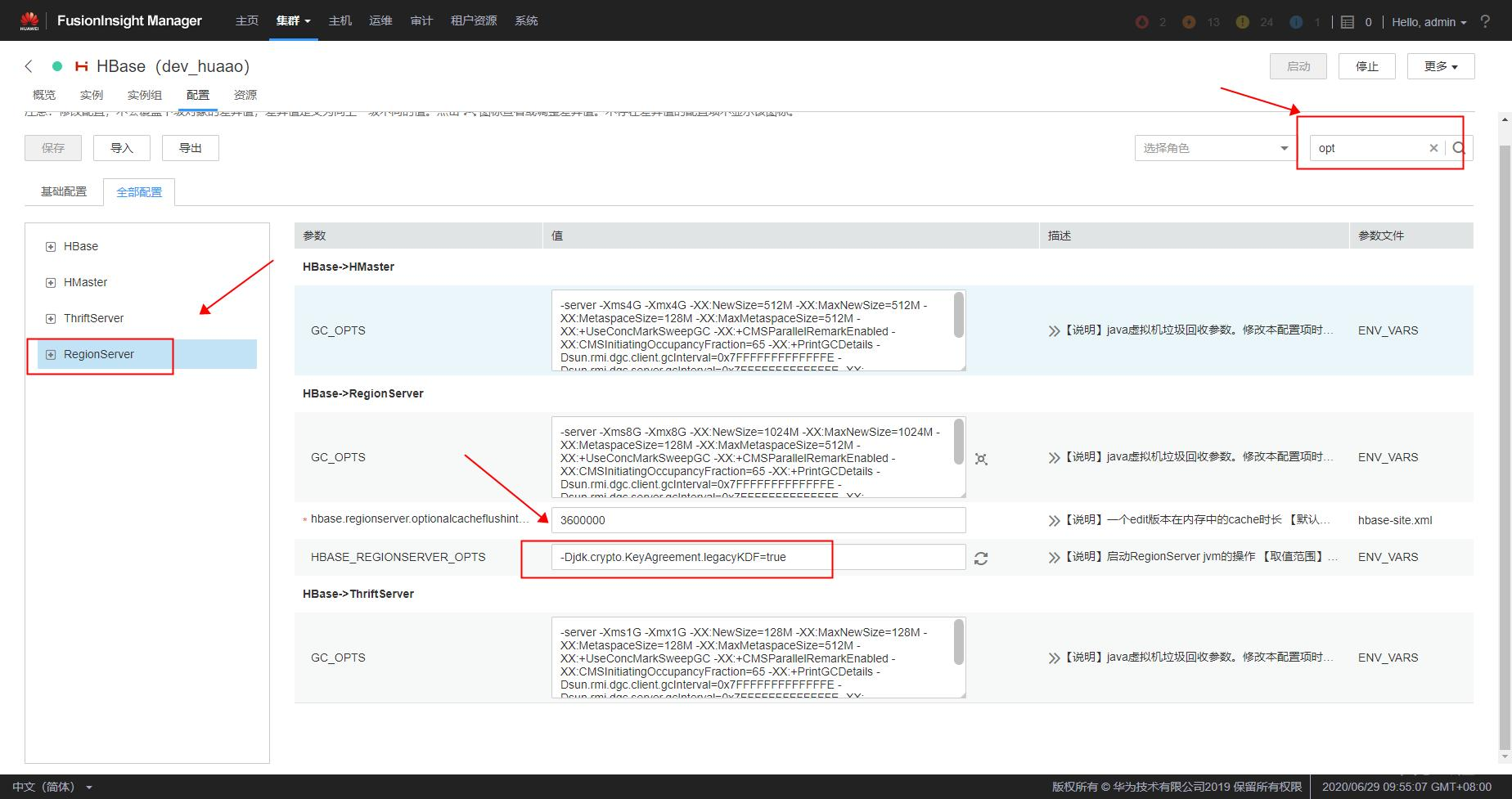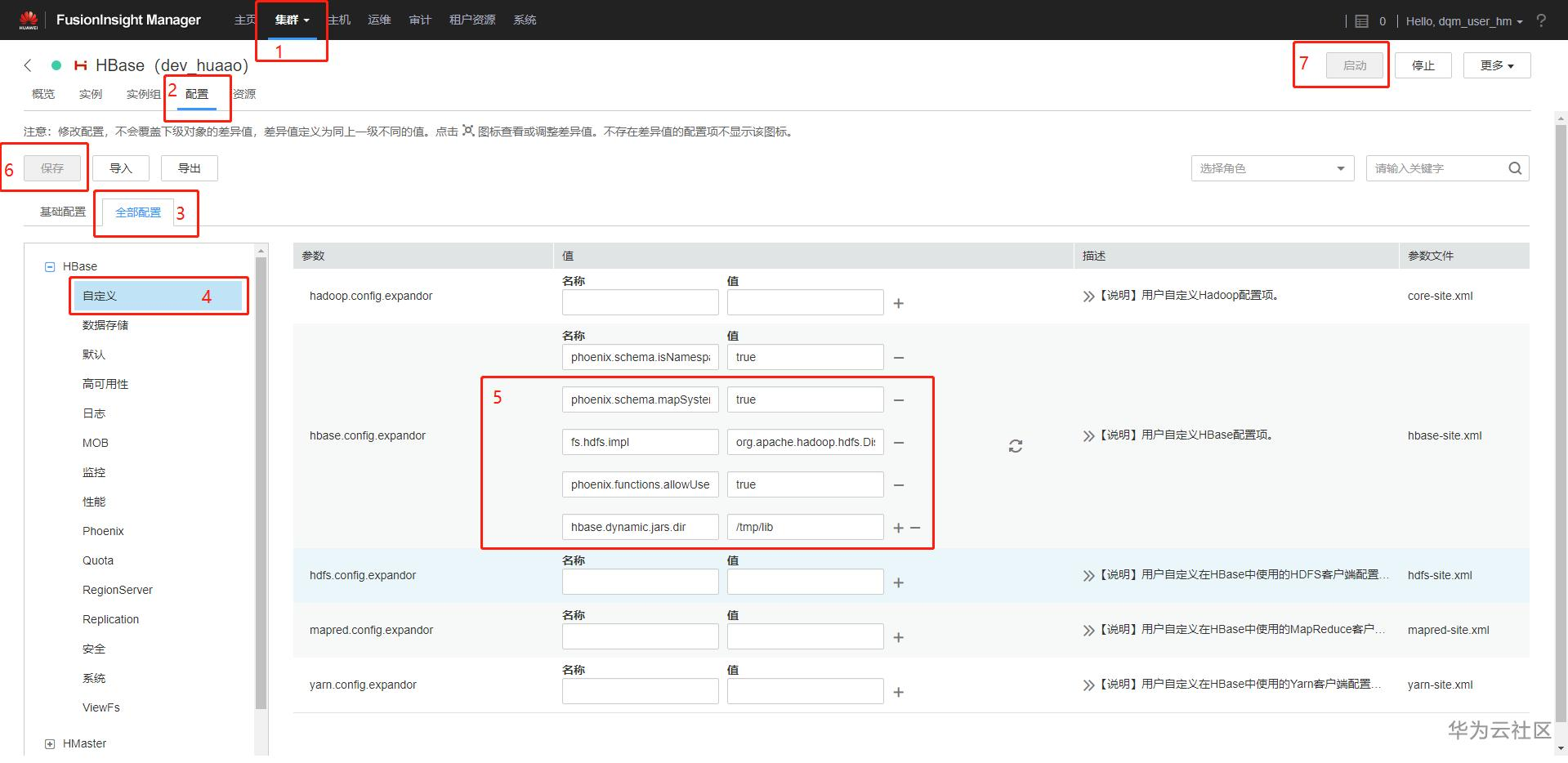 3.如果是华为FusionInsight HD则需要在配置上述name和value值(华为HD有可能已配置,已配置的不要再配置,否则将引起未知问题),保存后重启HBase,重新下载客户端安装(如果只是配置改变,可以在客户端hbase-site.xml中单独修改即可)