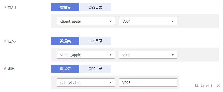 在输入1中选择源域:卡通苹果数据集clipart_apple,在输入2中选择目标域:素描苹果数据集sketch_apple,在输出中选择空的数据集。