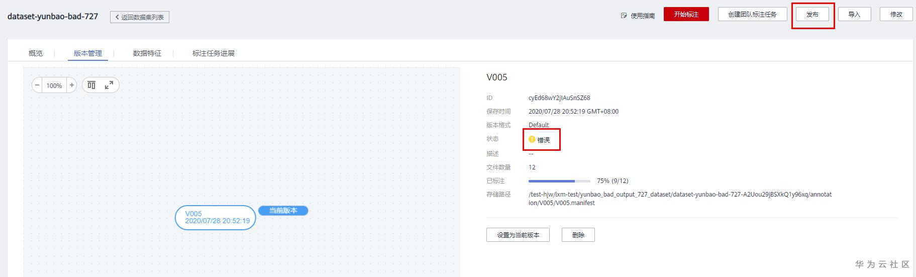 点击 发布 创建数据集版本,显示创建失败