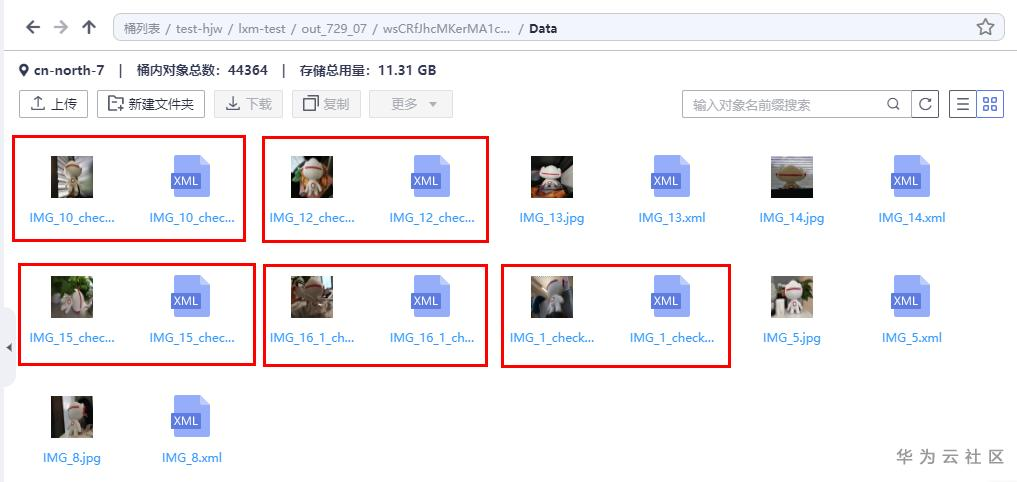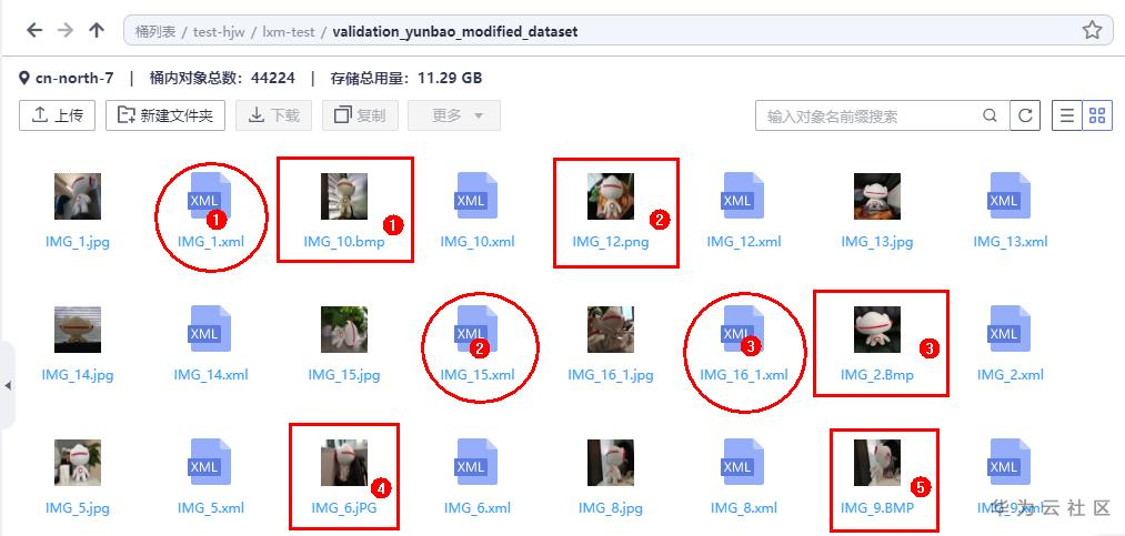 上传样例数据集,使用OBS Browser+ 工具上传数据至OBS桶中,将数据存放在自定义目录下,样例数据目录 validation_yunbao_modified_dataset 包含12张图片及其标准标注xml文件。12张图片皆为jpg格式,其中有5张图片被人为修改了后缀名;另有3个xml文件被人为修改了标注框的值,使其超出图片边界。