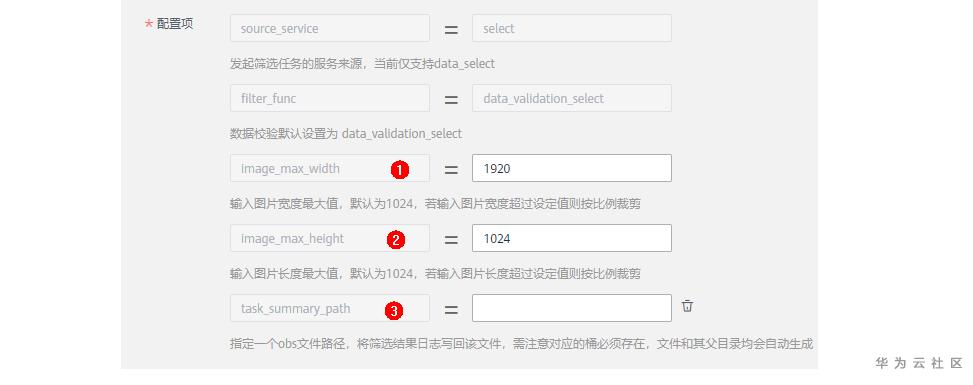 设置参数,其中 image_max_width 为输入图片的宽度的最大值,若用户输入图片宽度大于该值,则会按比例剪裁,image_max_height 为输入图片的高度最大值,若用户输入图片宽度大于该值,也会按比例剪裁,这两个参数可由用户自定义输入值,如果有标注文件,并且图像被裁剪了,标注框也会被等比例裁剪。 task_summary_path 为输出日志路径,需要用户指定一个obs路径来存放生成的日志,该参数为可选项,可以删除。另外数据校验算法的内置参数会将输入图片统一转换为三通道;若图片格式与后缀不一致时,会根据图片实际格式来修改其后缀;若xml文件中标注框超出了图片边界,超出部分面积小于整个标注框面积50%时,会保留该框在图片内的部分,反之则会被舍弃掉。