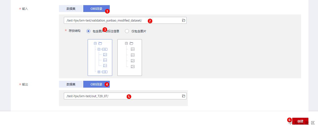 数据校验的输入、输出都可以指定为数据集或obs目录形式。例如选择输入为obs目录,则指定 validation_yunbao_modified_dataset 数据集的存放路径,因为数据集中包含了标注信息,因此存放结构选择 包含图片和标注信息 ,校验过后的数据保存到指定的obs桶目录中。确定了输入、输出后,点击 创建 开启数据校验任务。