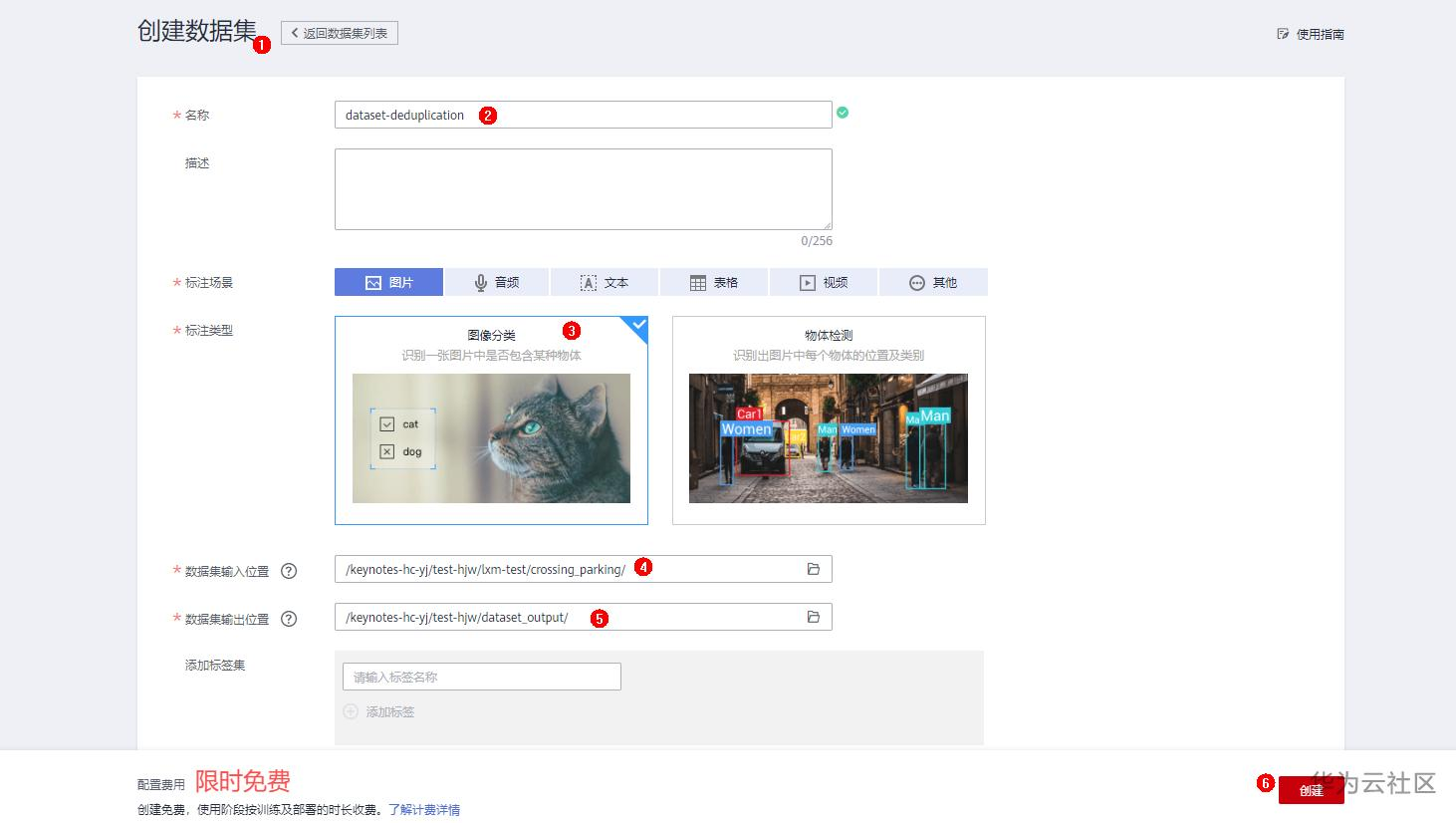 点击页面上的 创建数据集 按钮,创建一个叫dataset-deduplication的数据集,创建数据集页面填写示例: