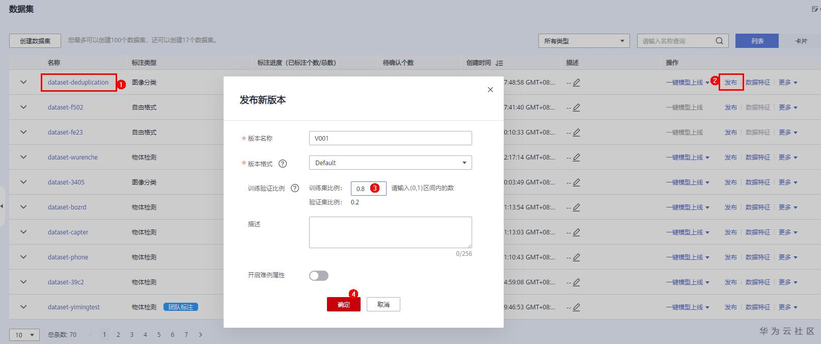 回到数据集创建页面,点击发布按钮,发布训练集。数据集发布之后,就可以在后面的步骤中使用了。