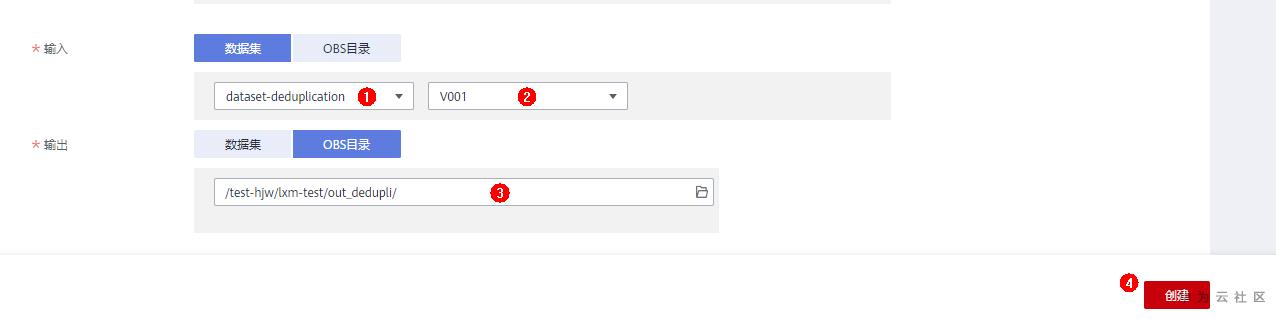 数据去重的输入、输出都可以指定为数据集或obs目录形式。例如选择 dataset-deduplication 分类数据集作为输入,去重过后的数据保存到指定的obs桶目录中。确定了输入、输出后,点击 创建 开启数据去重任务,