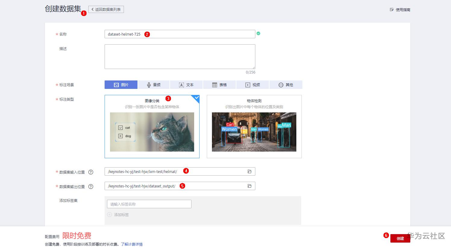 点击页面上的 创建数据集 按钮,创建一个叫dataset-helmet-725 的数据集,创建数据集页面填写示例: