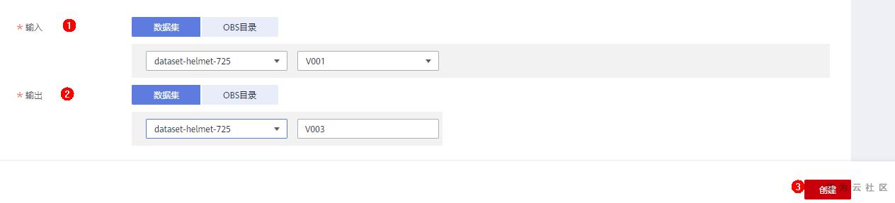 数据清洗的输入、输出都可以指定为数据集或obs目录形式。例如选择 dataset-helmet-725 分类数据集作为输入,清洗过后的数据保存到 dataset-helmet-725 的新版本中。确定了输入、输出后,点击 创建 开启数据清洗任务