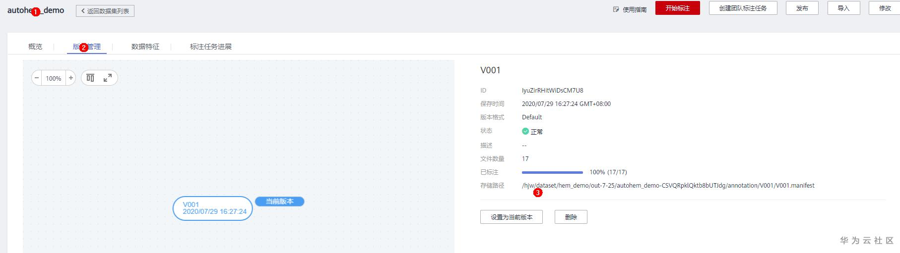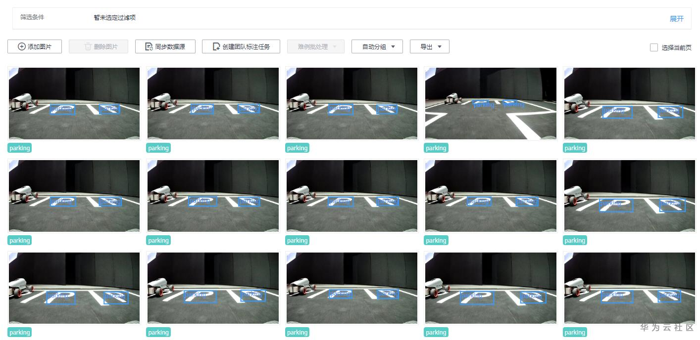 首先,我们将拍摄后含有停车位的图片上传至OBS,并导入Modelarts的新建数据集(命名为 autohem_demo)中, 将数据集中的停车位标注完成后,发布一个数据集版本。如下图:
