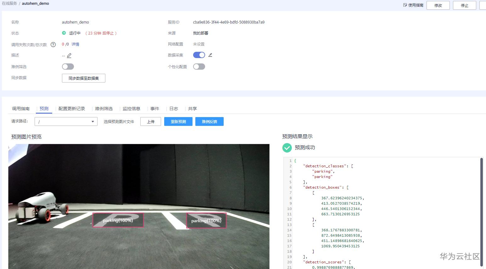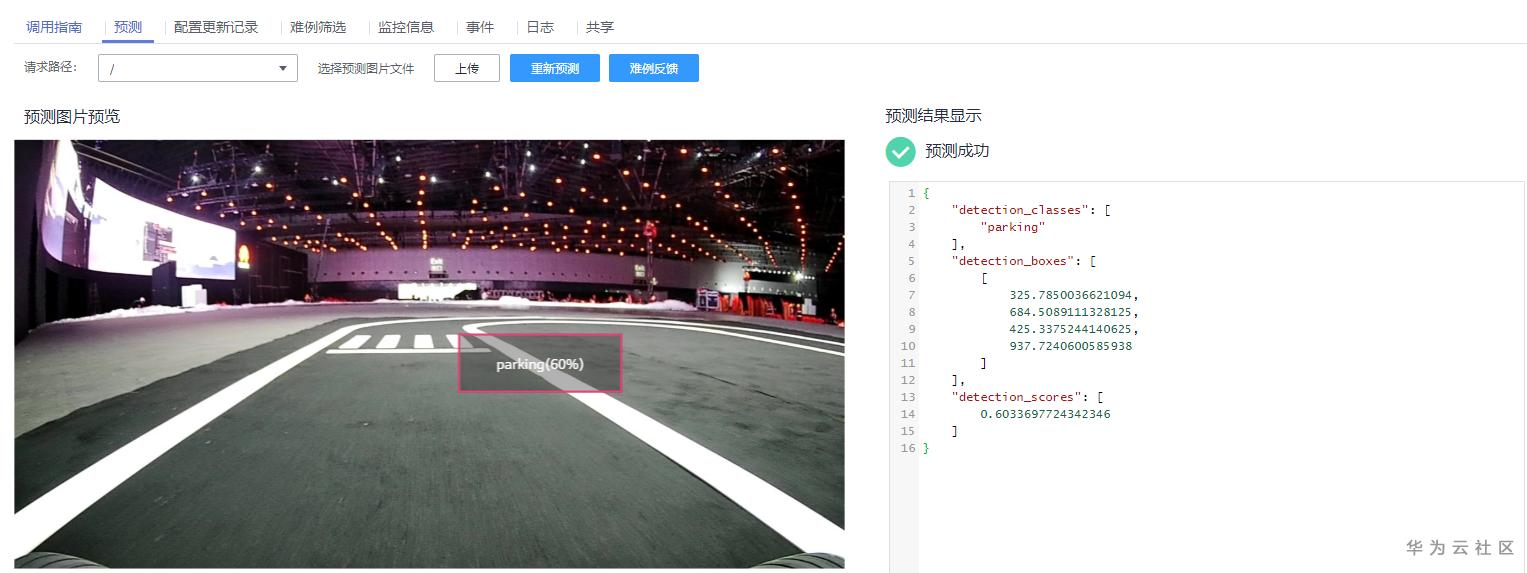 使用Modelarts的一键模型部署上线功能,该功能在数据集上使用预置算法 Faster_RCNN_ResNet_v1_50 训练数据得到一个可以识别停车位的模型,之后通过Modelarts的在线服务部署该模型,对外提供一个可预测的Rest API。如下图: