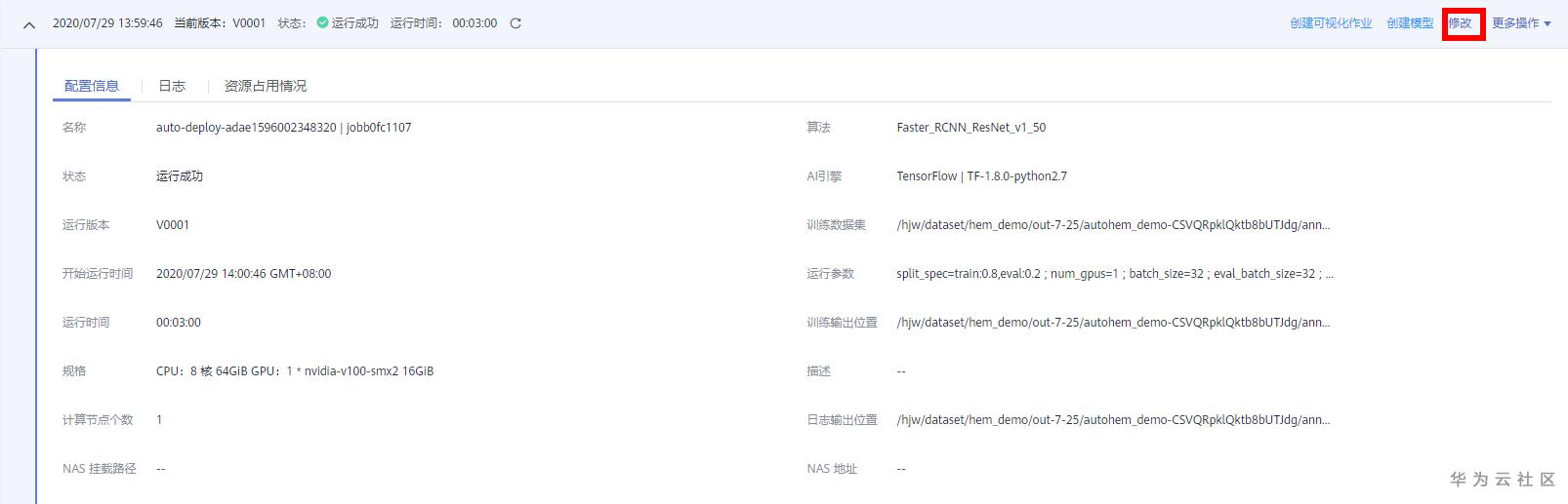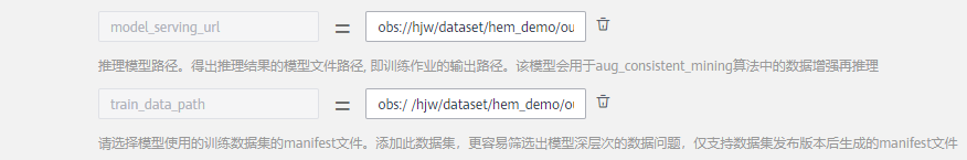 train_data_path即为步骤1中发布数据集版本后的manifest文件,这个文件在Modelarts平台上可理解为一个固定的数据集,找到manifest文件之后,添加 'obs:/' 前缀并填入运行参数,如:obs://hjw/dataset/hem_demo/out-7-25/autohem_demo-CSVQRpklQktb8bUTJdg/annotation/V001/V001.manifest: