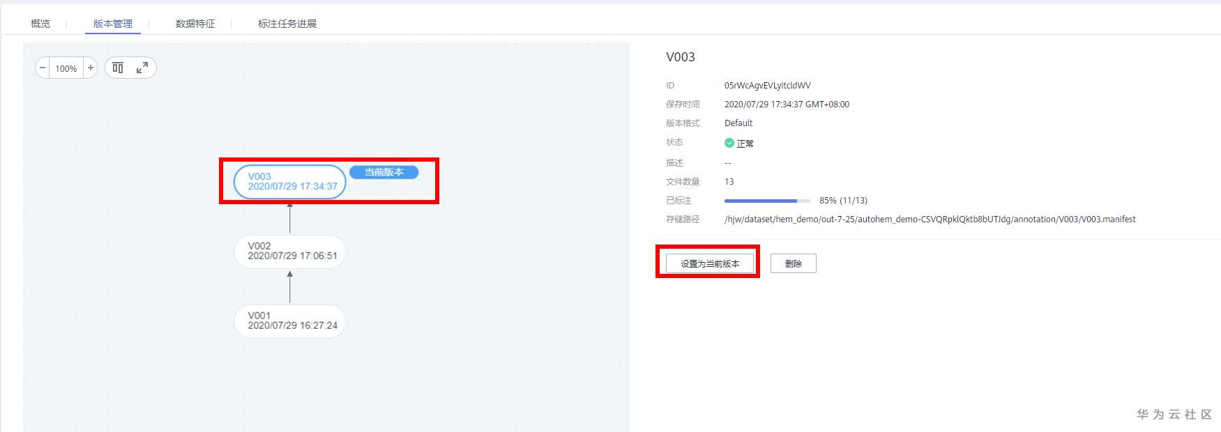 待数据处理的难例筛选任务完成后,进入数据集版本管理,可以看到筛选结果已经发布到V002版本,点击切换至V002版本,即可查看筛选结果,如下: