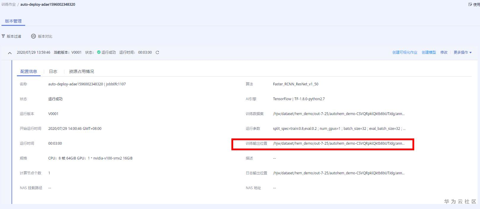 训练作业的输出位置即为模型元数据存储路径,如下图: