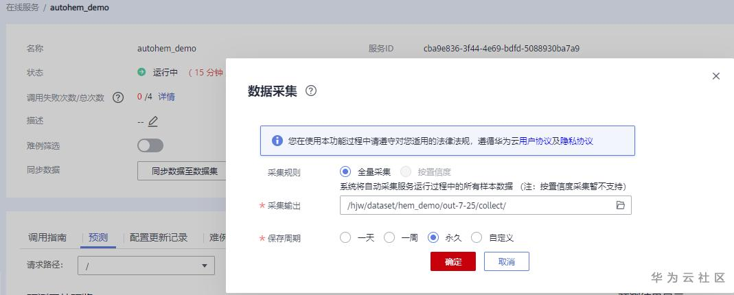 难例筛选算法需要分析的数据是模型部署后,不断使用模型进行预测的推理数据。Modelarts平台提供了全量数据采集的功能,可帮助保存模型部署后,通过调用预测API的数据和推理结果。这个功能需要手动开启,如下图: