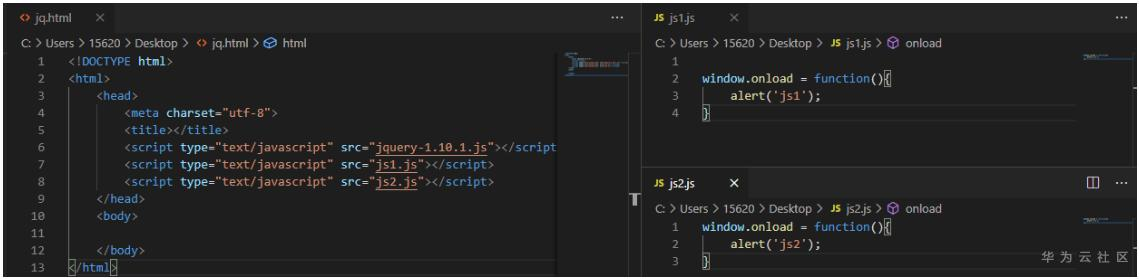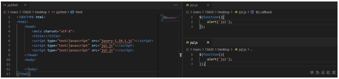 同样是一个网页中包含多个$(function(){}),运行代码后,每个js文件中的代码都依次执行,依次弹出"jq1","jq2"