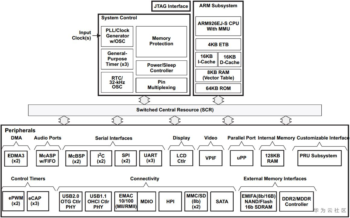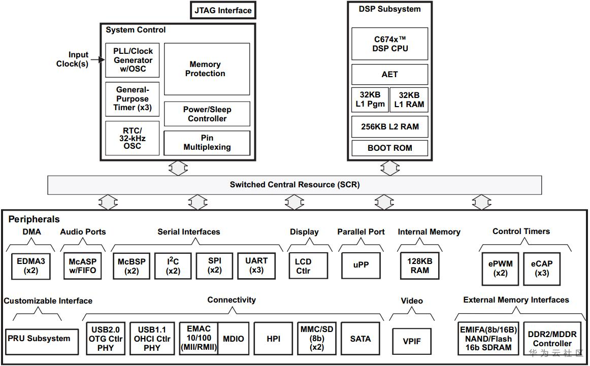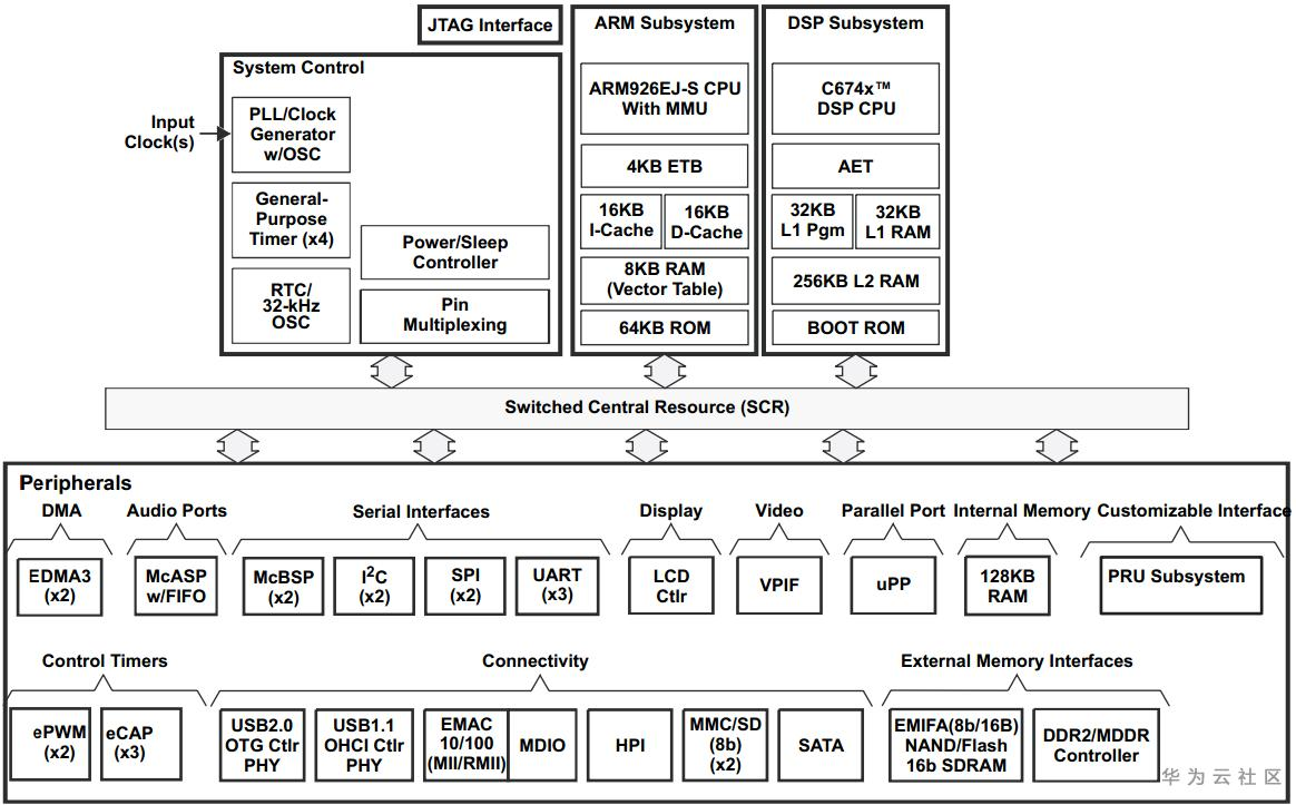 TI公司的达芬奇架构嵌入式应用处理器开始使用DSP与ARM结合的非对称多核结构,OMAP-L138就是其中的一款低功耗双核嵌入式处理器。OMAP-L138双核架构兼具DSP的高数字信号处理性能和精简指令计算机(RISC)技术的优点,双核均是32位处理器。以下是OMAP-L138 CPU的资源框图: