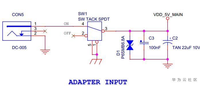 采用5V直流电源供电,CON5是电源接口,SW1是电源拨码开关,原理图如下图所示: