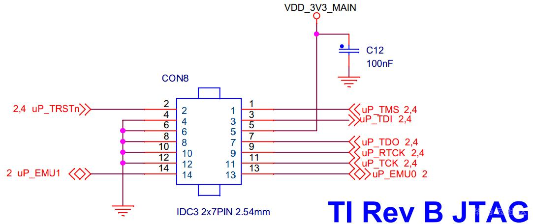 可以通过JTAG接口烧写Bootloader和进行软件调试。CON8提供了包含完整JTAG标准信号的14Pin JTAG接口,2.54mm间距,各引脚定义如下图: