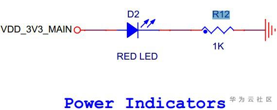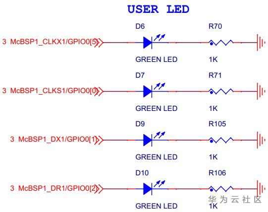 开发板底板具有1个电源指示灯D2,以及4个用户可编程指示灯,它们分别是D6、D7、D9和D10,原理图如下: