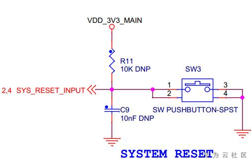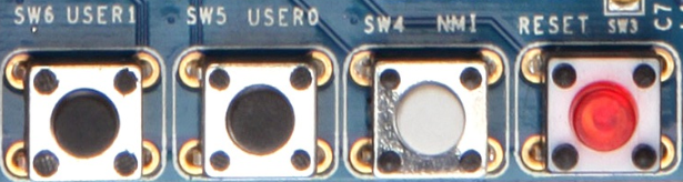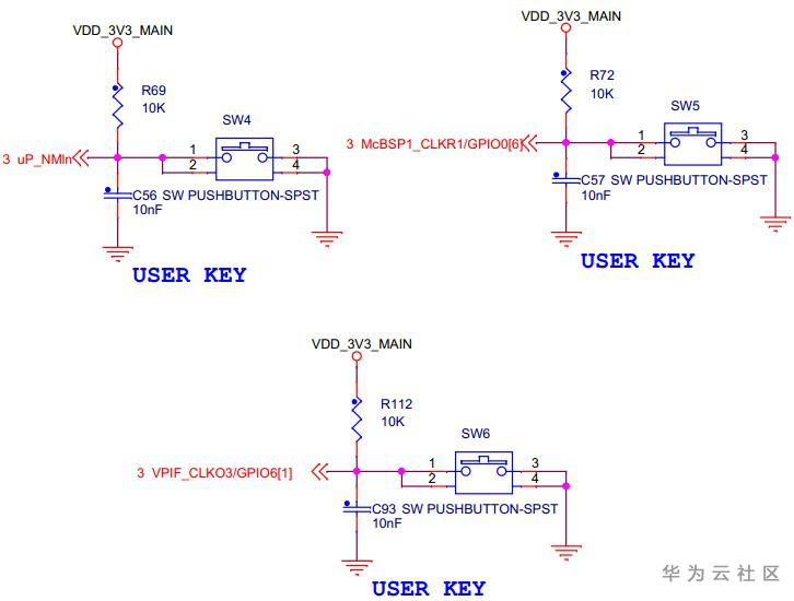 开发板总共有1个系统复位按键SW3、1个非屏蔽中断按键SW4、2个用户测试用按键SW5和SW6,原理图如下: