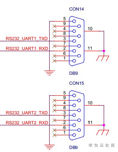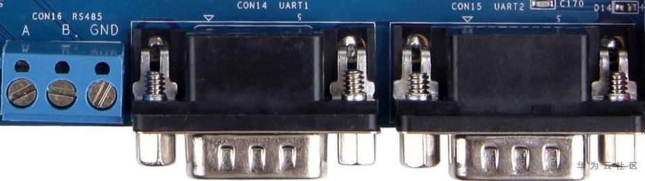 开发板共引出了3个串口,分别是CON14、CON15、CON16。CON14和CON15是由UART1和UART2通过MAX3232串口电平转换芯片得到的RS232串口,使用的是9针DB9接口。CON16则是由UART1通过ISO3082DW串口转换芯片得到的RS485串口。因此,CON14和CON16是复用的。RS232串口可以通过交叉串口线和PC互相通讯。3个串口在开发板上的位置、引脚定义如下图所示: