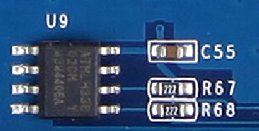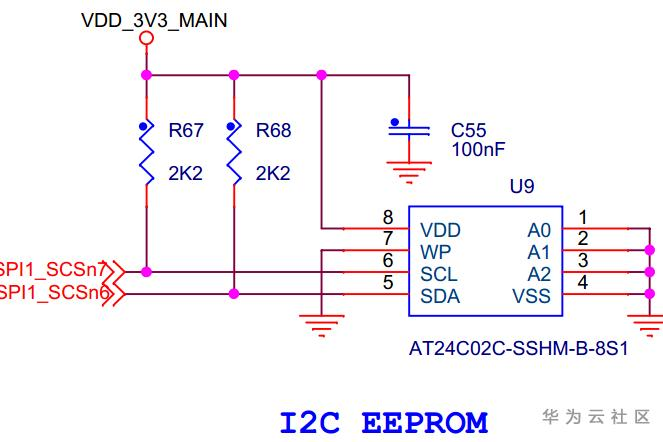 U9是1个I2C总线接口的EEPROM,型号为AT24C02C,容量是256Bytes,地址是0x50(高7位)。以下为EEPROM的电路图: