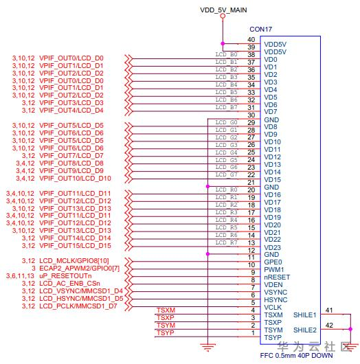 CON17带有40pin、0.5mm间距LCD触摸屏接口,也叫FFC排线座。LCD接口座中包含了常见LCD所用的全部控制信号(行场扫描、时钟和使能等)。其中,1、2、3、4四线为触摸屏接口,接口定义如下图所示: