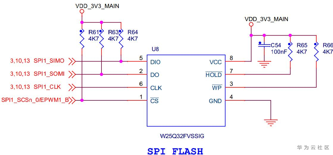 U8是1个SPI FLASH,型号为W25Q32FVSSIG,容量是4MBytes,使用SPI1的CS0。以下为SPI FLASH的电路图: