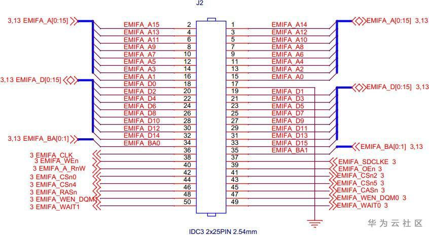 J2是EMIFA接口,通过EMIFA可实现开发板与不同类型存储设备的连接,例如并口AD模块、多串口模块,其引脚定义如下: