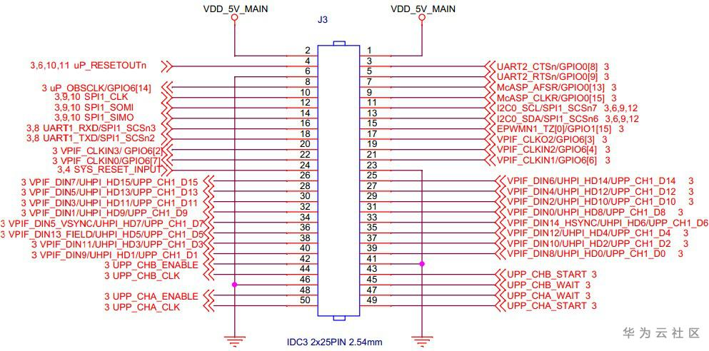 J3提供了GPIO、SPI、I2C、uPP、UART等拓展信号,方便客户实现功能模块拓展,比如外接CMOS摄像头、FPGA高速数据采集板卡等模块、多通道DA模块,引脚定义如下图: