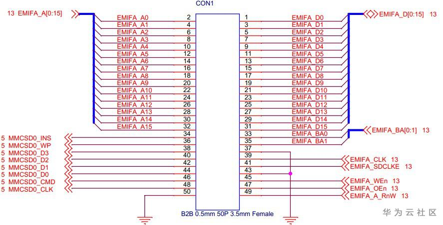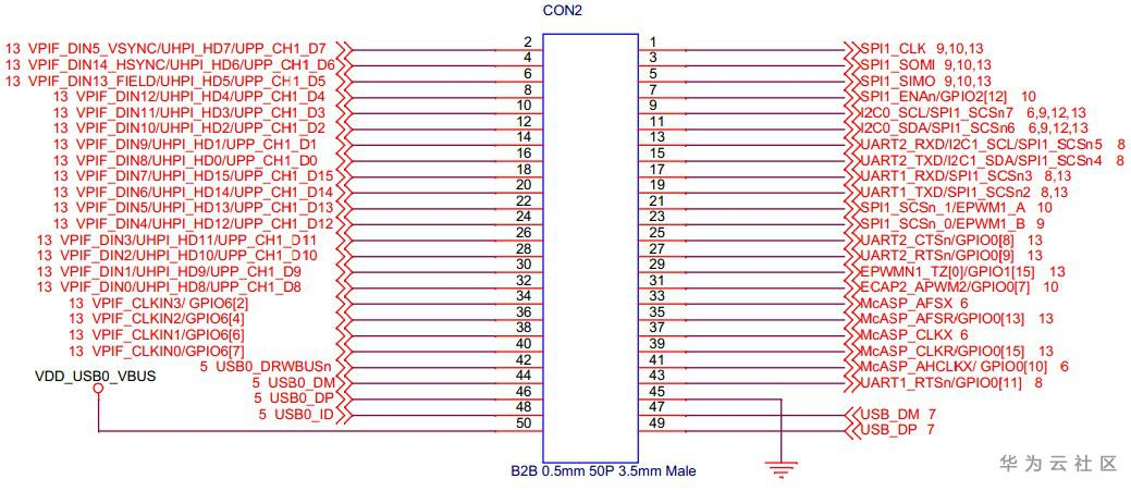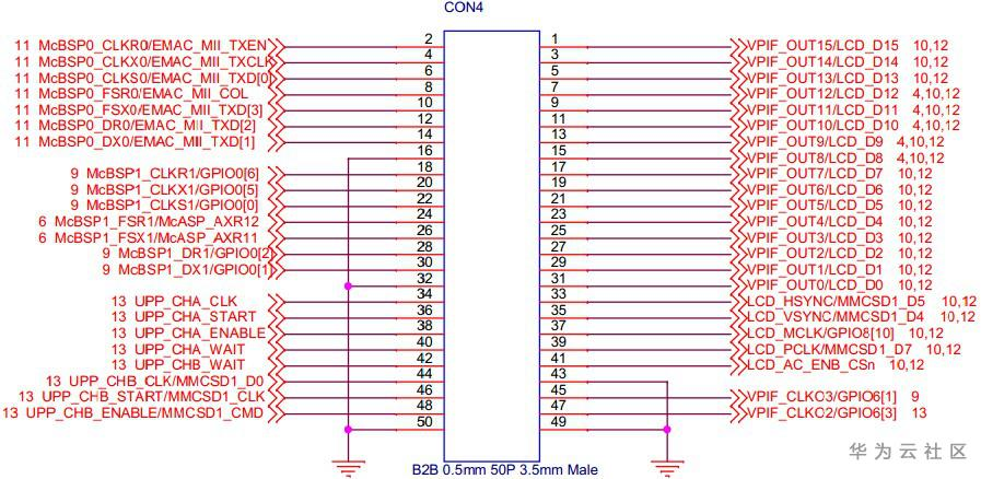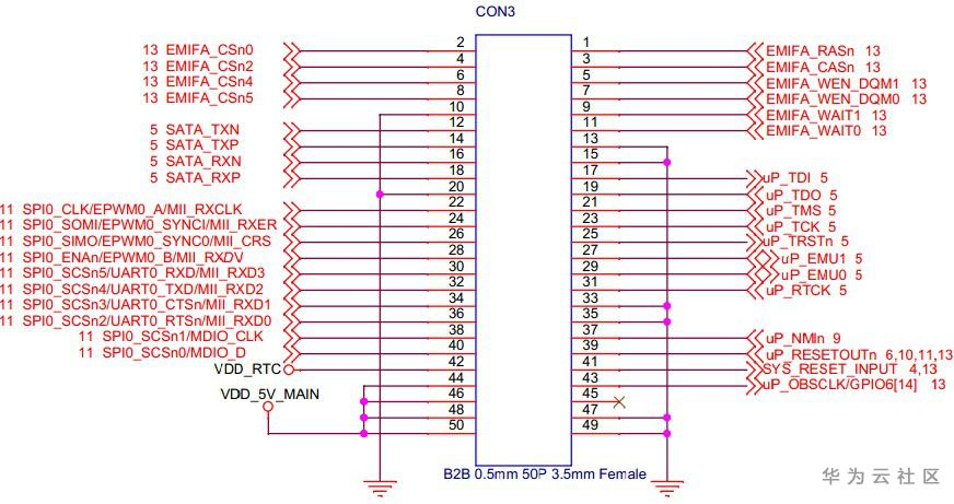 开发板底板上有4个50pin、0.5mm间距的B2B连接器,其中CON1和CON3是母座,CON2和CON4是公座,用于和核心板连接,以下为底板各个B2B的引脚定义: