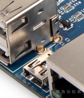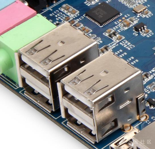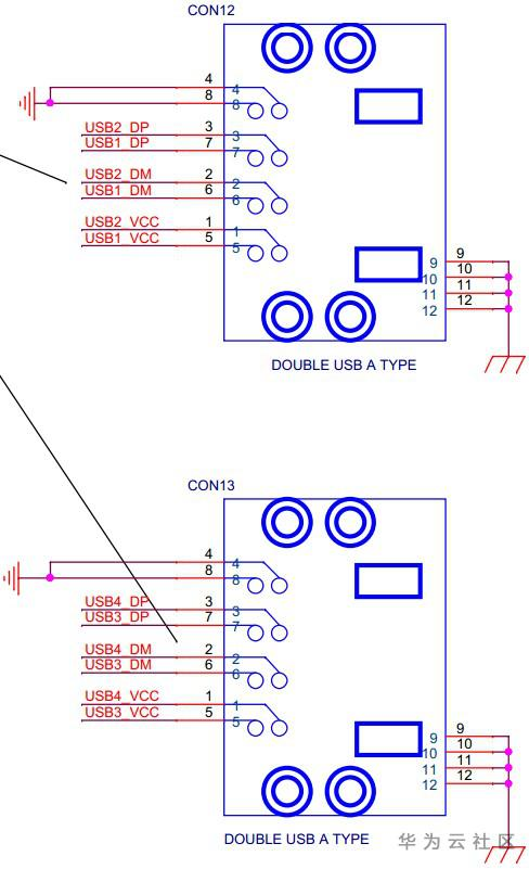 CON12和CON13是2个双层USB接口,共4个A型USB 1.1 HOST,理论速度12Mbps,它和普通PC的USB接口是一样的,可以接USB摄像头、USB键盘、USB鼠标、U盘等常见的USB外设。这4个USB HOST是由一个USB Hub芯片扩展得到的。其引脚定义如下图: