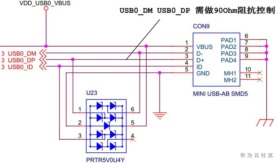 CON9是Mini USB 2.0 OTG接口,理论速度480Mbps,主要应用于各种不同的设备或移动设备等从设备间的连接,进行数据交换。其引脚定义如下图:
