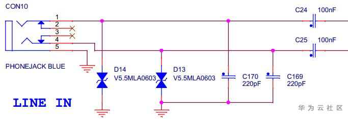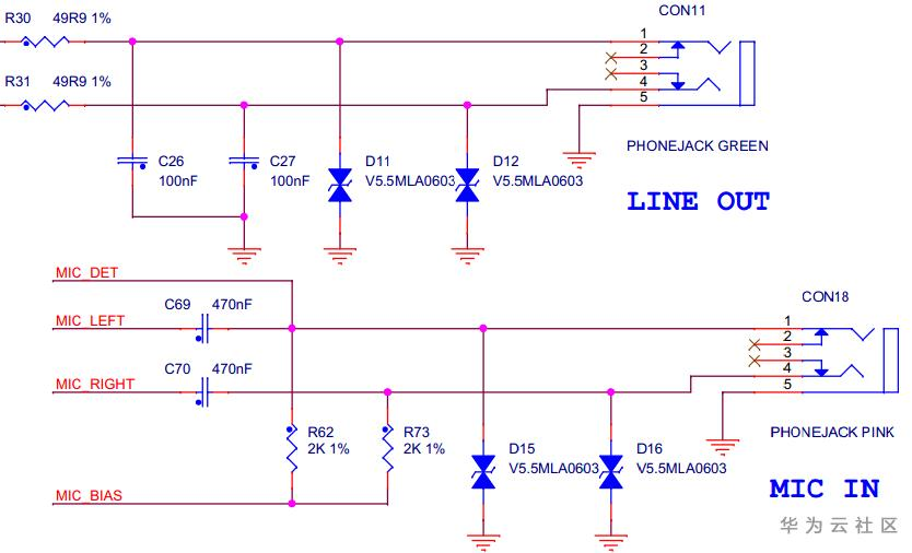 开发板带有音频输入和输出接口,使用TLV320AIC3106IRGZ音频芯片。CON10为Line in音频输入接口,CON11为Line out音频输出接口,CON18为Mic in音频输入接口。以上三者均使用3.5mm直径接口,实图和原理图如下:
