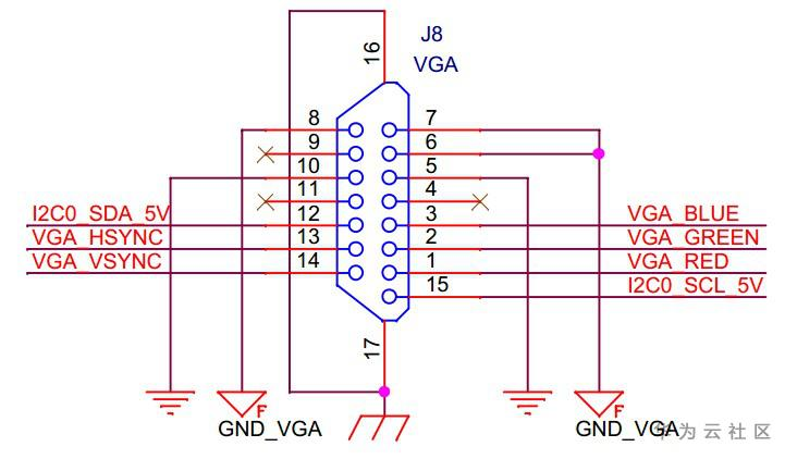 J8是VGA视频输出接口,分辨率可达1024*1024,使用的VGA视频芯片是芯海科技的CS7123,以下为VGA输出接口的引脚定义: